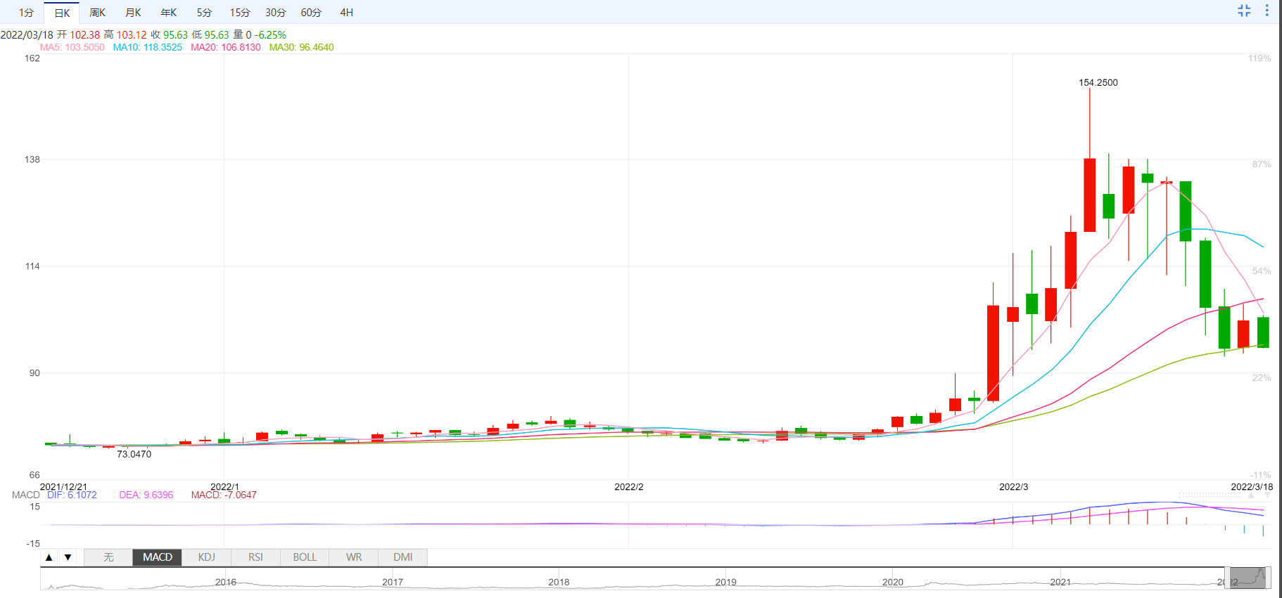 两油暴力反弹,在重返100美元关口后继续高歌猛进。WTI原油最终收涨9.04%,报103.60美元/桶;布伦特原油最终收涨9.13%,报106.89美元/桶。 克里姆林宫指出,有关乌克兰谈判取得重大进展的报道"错误",与乌克兰达成明确的协议可以迅速结束这场危机。发言人佩斯科夫称,俄罗斯代表团准备进行24小时的谈判,基辅却没有那么