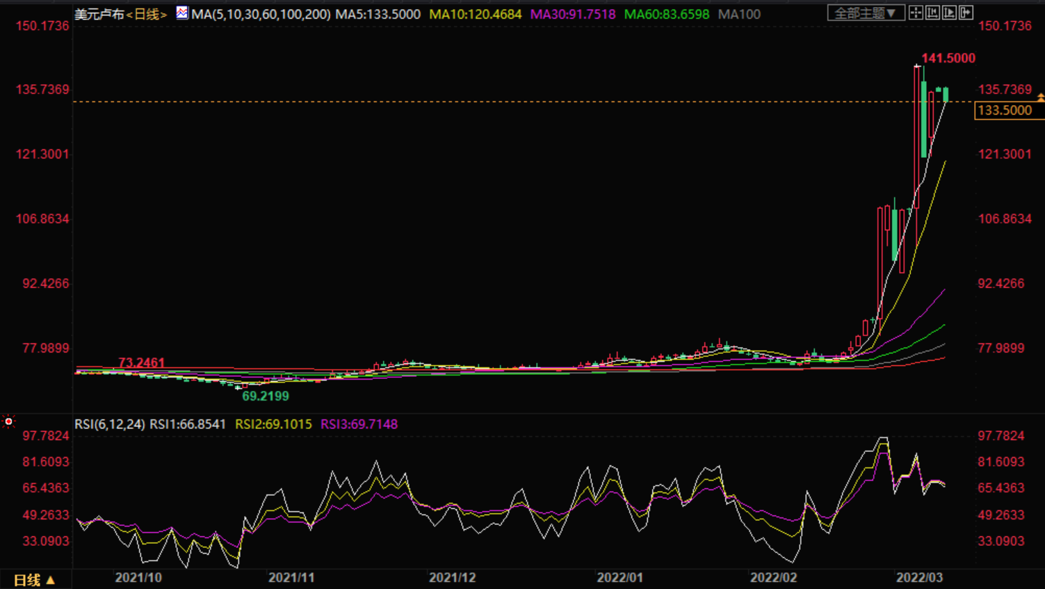 美国总统乔·拜登决定通过禁止石油进口来孤立俄罗斯之后,美元/俄罗斯卢布迅速上涨。由于美国及其盟国对俄罗斯原油实施禁令将抑制其资金流入的很大一部分,俄罗斯卢布/美元面临巨大抛售压力。 欧洲宣布打算在一年内减少三分之二的俄罗斯天然气进口后,美国的这一决定得到了欧洲各国的支持。对此,俄罗斯副总理亚历山大
