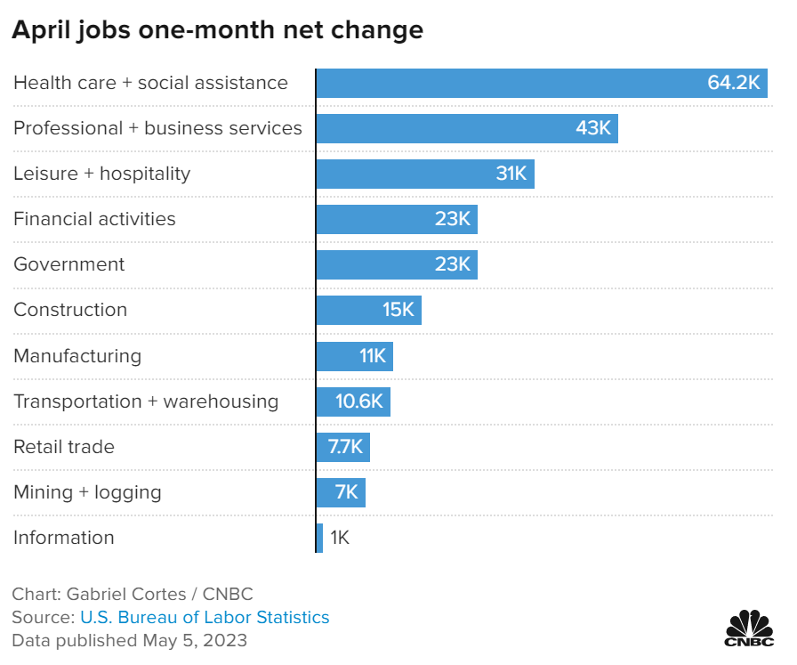 面对银行业危机和日益增长的经济衰退担忧,整体就业增长帮助劳动力市场显示出弹性。 美国劳工统计局周五公布的数据显示,4月份非农就业人数增加了25.3万人。这比道琼斯估计的18万还要多。 周五的数据支持了这样一种观点,即尽管有迹象显示整体经济放缓,但劳动力市场仍然异常强劲。 近四分之一的新工作是在医疗保