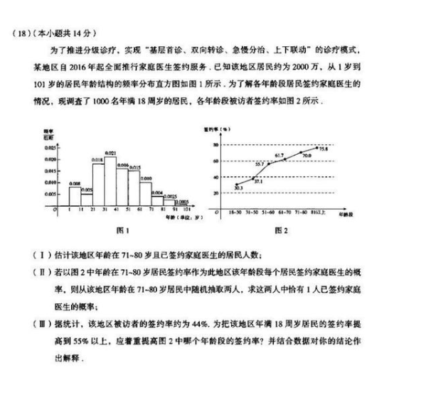 从图 2 看,只有 18~30 岁,31~50 岁这两个年龄段的签约率低于55% ,,由图 1 可知,31~50 岁年龄段的人数为(0.21+ 0.16) x2000 = 740 万人, 18~30 岁年龄段的人数少于(0.05 + 0.18) x2000 = 460 万人,