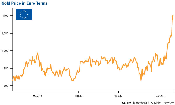 1月初,欧元计价的黄金打破了长期以来筑底的1000欧元/盎司,黄金价格爆发,欧元自1000欧元起开始瓦解,黄金价格在几周内上涨了10%。瑞士央行放弃瑞郎上限导致欧元大跌,投资者买入黄金避险,确认了黄金的避险地位。而欧元则日益成为投资者焦虑的来源,而不是像其创立者当初设想的那样是稳定性的源泉。
