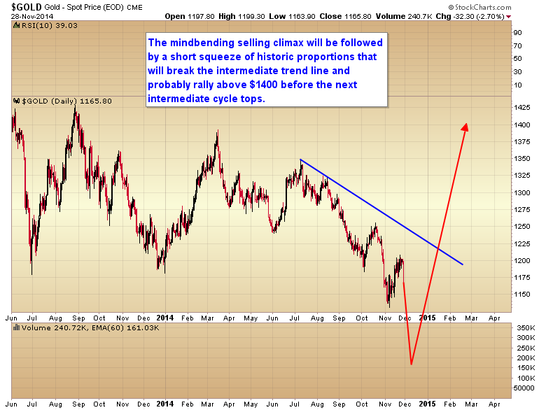 如果瑞士公投能顺利通过,那么上周五黄金的跌幅将极有可能被收复,行情也可以说是完全筑底,但历史是不能假设的。如今,瑞士公投的消息已经尘埃落定,而黄金后市将何去何从是投资者最关心的,笔者认为最有可能的情况是未来5-10个交易日内黄金价格将在1000-1050美元/盎司筑底。金价已经进入了短周期循环的末期,本周一将是此次循环的第16个交易日,由于平均的短周期循环筑底为18-28个交易日,因此如果11月初价格并未筑底的话,未来5-10日将非常值得关注。