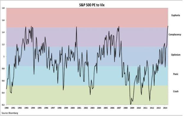 标准普尔/波动率指数比率(标准普尔的市盈率除以波动率指数)同样是股市崩溃的信号。仔细注意在2000年和2007年的这一比例,这暗示着股票抛售的信号。