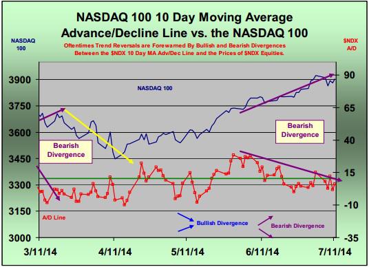 上图中,我们看到类似的看跌的背离发生在10日平均上涨/下跌线指标、小型股罗素2000价格指数以及纳斯达克100。这些背离即将成熟,这意味着股市顶部已形成并应该在接下来的两周开始大幅下跌。