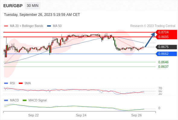 欧元/英镑 当日内: 有上涨的可能,目标价位定在 0.8704 。