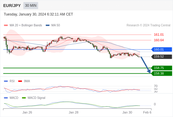 欧元/日元 当日内: 看跌,在 160.01 之下。