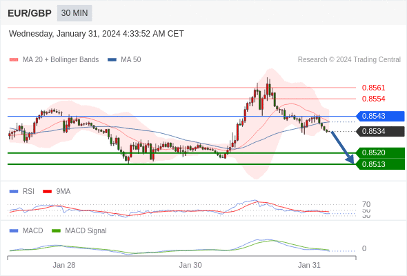 欧元/英镑 当日内: 看跌,在 0.8543 之下。