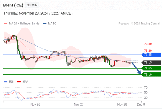 布伦特原油 (ICE)? (G5)? 当日内: 短期关键阻力位在72.85。