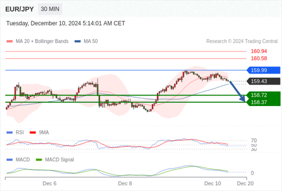 欧元/日元 当日内: 逐渐下跌,当 159.99 阻碍上行,则 158.37 为目标位。