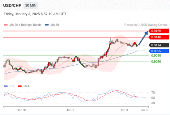 在 0.9095 之上,看涨,目标价位为 0.9140 ,然后为 0.9160 。