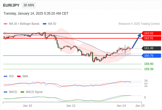 欧元/日元 当日内: 看涨,当 160.76 为支撑位,目标定在163.02。
