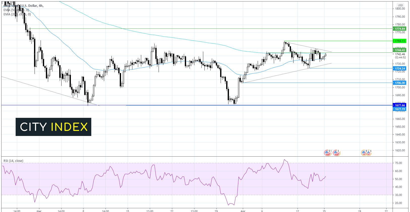 黄金多头需要攻克200期指数移动均线兼1742水平支撑位后上攻三角形上轨1747才可能延续涨势,站上1747,多头可能上看月度高点1760。