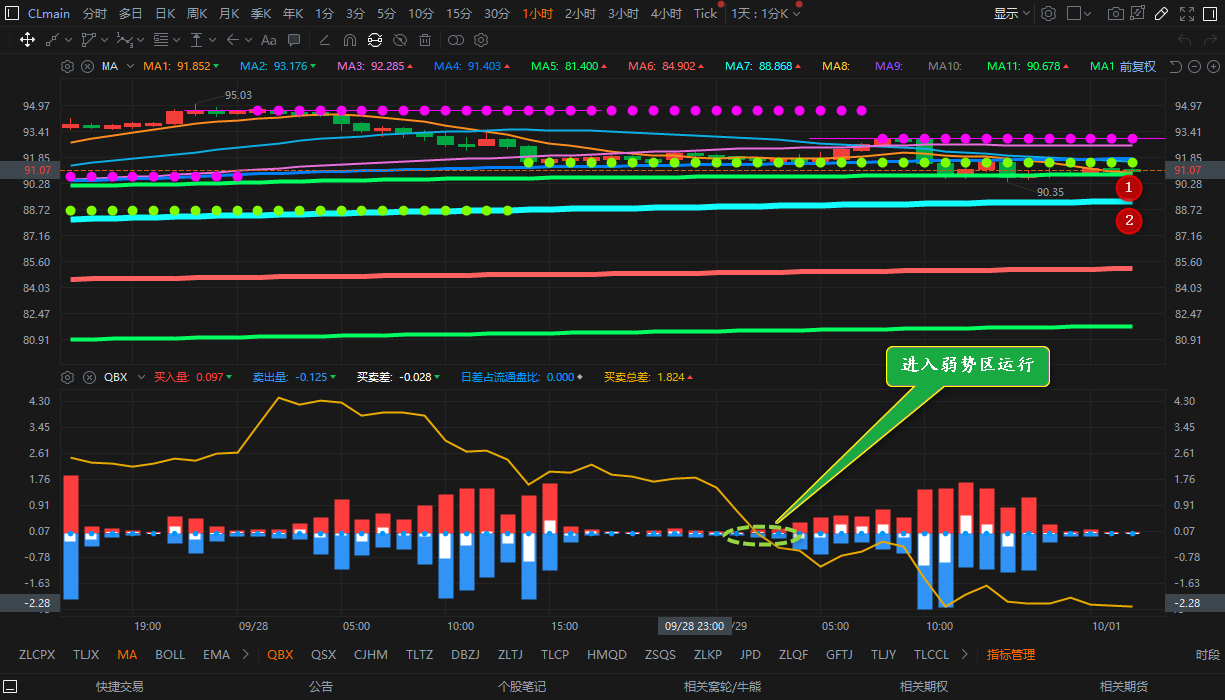 通过对原油小时图解析得知,上一个交易日先跌后涨再下跌,形成宽幅震荡走势,在下方1号均线支撑位有所收敛,我们从下方的附图可以清楚的看到在上一个交易日的时候行情就已经进入弱势区运行,反弹无力,目前依然是在弱势区运行,说明短期市场还有调整空间,短期下方我们重点关注1,2号均线的支撑,在操作上我们继续高空低多思路,具体建议如下: