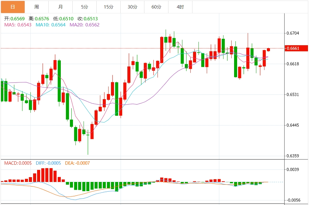 预期交易区间在支撑位0.6620$和阻力位0.6720$之间。