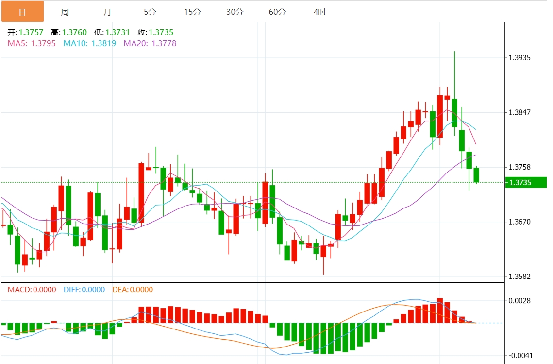 技术上,在经历了七月下旬的无情抛售之后,目前从图表上看,加元的反弹似乎同样没有停止。 美元/加元的日线和周线价格讯号看跌,短期讯号显示加元还有更大的上涨空间,现货价格跌破1.36/1.3950 涨势的50%回档位(1.3768),向1.3675/1.3725逼近。 阻力位在1.3790。