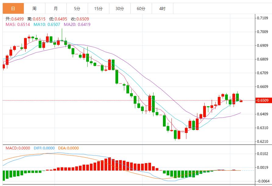从短线技术面来看,纽元/美元可能会延续处在 0.6600 和0.6450 区间的周线交易区间,短线倾向于上行。14 日相对强弱指标处在中线紧上方,令多头维持期待。