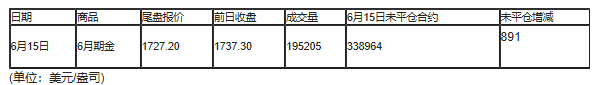 COMEX 8月期金未平仓合约增加891手(6月15日)