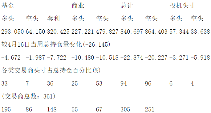 美国商品期货交易委员会(CFTC)最新公布截止4月23日当周COMEX黄金期货和期权分类持仓报告:
