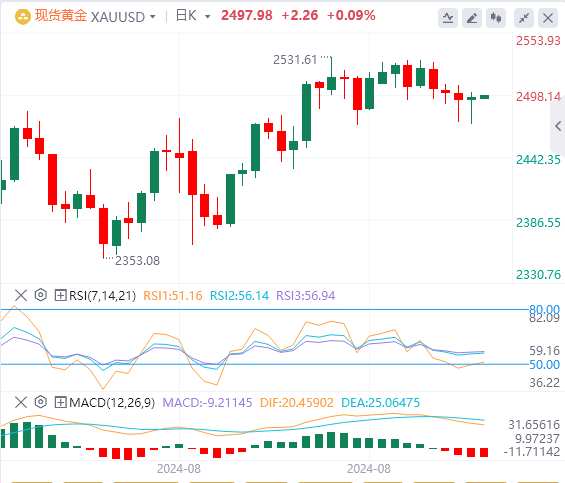 如果金价日收盘位于2500美元上方,下一个阻力位将是历史高点2531美元,然后是2550美元关口。一旦突破后者,金价将瞄准2600美元。