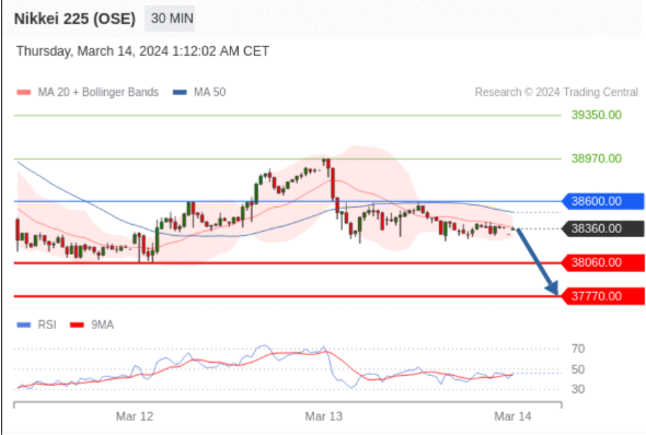 交易策略: 在 38600.00 之下,看跌,目标价位为 38060.00 ,然后为 37770.00 。